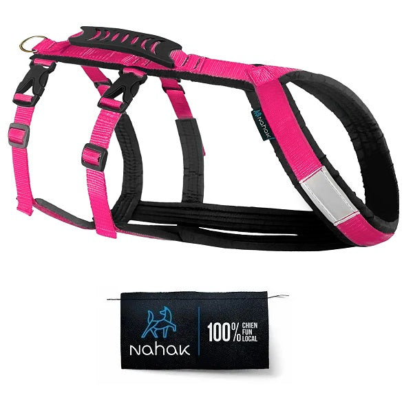 Le nouveau harnais hybride de Nahak est idéale pour une marche au pied (chien éduqué), la traction légère à modéré (tout sauf traîneau), ainsi que pour les activités où le chien est laissé lousse. Il est disponible en 4 couleurs (noir, rouge, rose et aqua) et en 4 grandeurs pour des chiens entre 20-35lbs, 35-95lbs et de 95-125lbs.